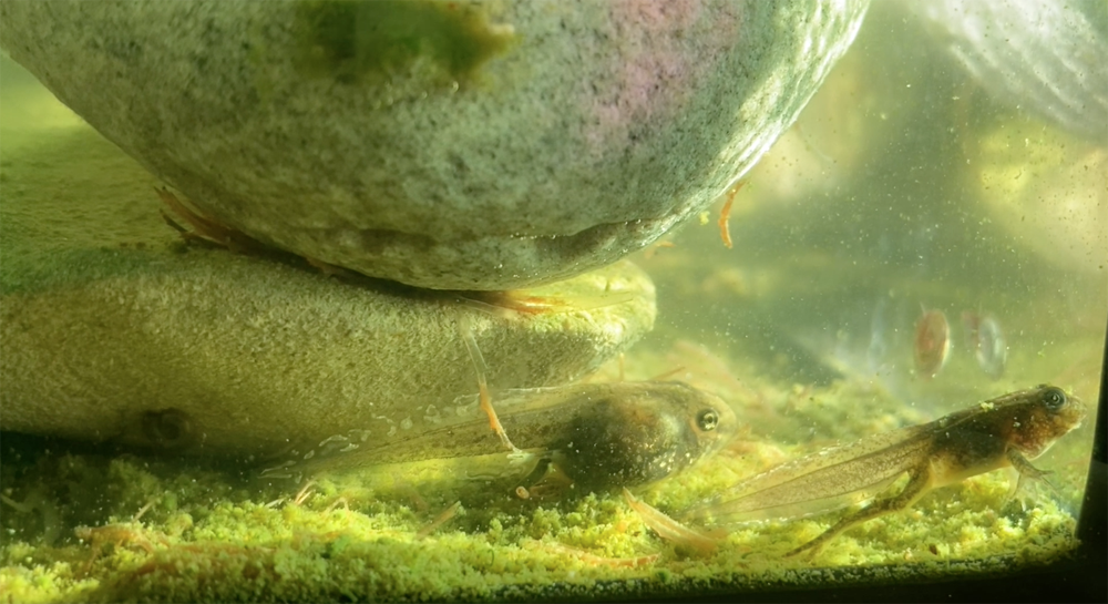 Foto waarop twee stadia te zien zijn van de ontwikkeing van paddenvisje tot pad.